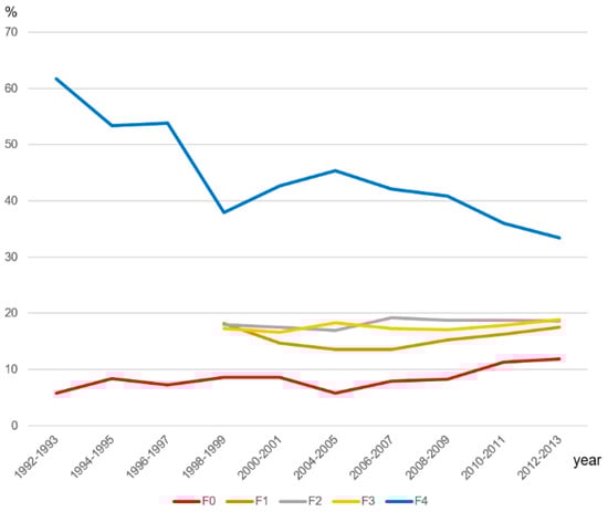 Incidence of F0 (non-fibrotic liver), F1, F2, F3, and F4 (cirrhosis) cases among all Japanese HCC cases. The graph shows change in incidence of background fibrosis in the liver in all HCC cases based on a series of annual reports from a Japanese multicenter survey. In 1992, HCC in non-fibrotic livers accounted for approximately 5.8% of resected HCCs in Japan; this number has grown each year and reached 10.8% in 2012. This curve also shows a rising incidence of HCC in chronic hepatitis (F1–F3) along with a parallel gradual increase in non-fibrotic livers (F0) with inversely decreasing incidence of liver cirrhosis.