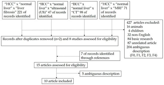 Initially, 437 articles were retrieved from our review. Additionally, seven articles were obtained through the manual review of the reference lists of relevant articles. From these 444 articles, 427 were excluded because of the following reasons: (1) 204 articles grouped F0 and F1 livers together and (2) 223 articles had insufficient clinical data. Finally, 10 articles were selected (Figure 2).