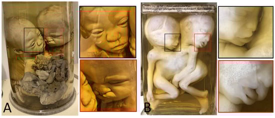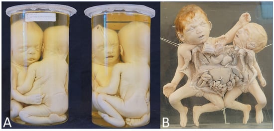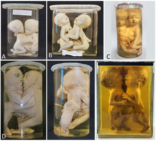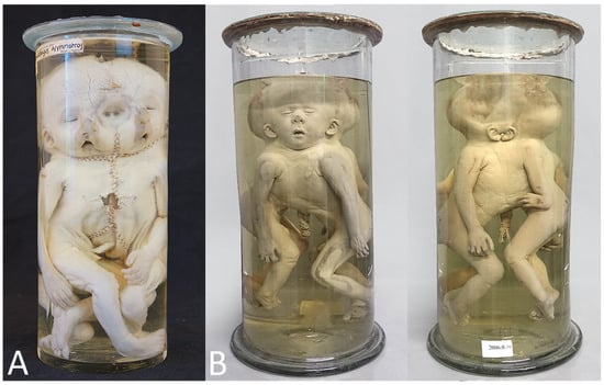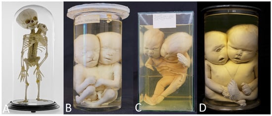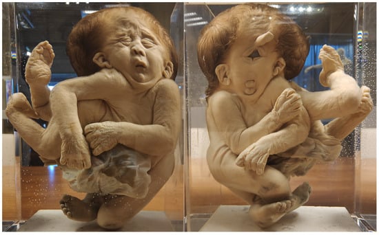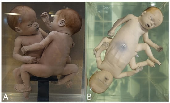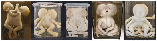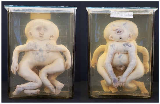 - Oostra, R.J.; Baljet, B.; Verbeeten, B.W.; Hennekam, R.C. Congenital anomalies in the teratological collection of Museum Vrolik in Amsterdam, The Netherlands. V: Conjoined and acardiac twins. Am. J. Med. Genet. 1998, 80, 74–89. [Google Scholar] [CrossRef]