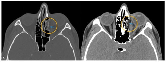 In the axial plane bone window (A) and parenchymal window (B) computed tomography (CT) images, there is a lamina papprisea fracture (yellow circle) in the medial wall of the orbit, and a partial orbital fatty tissue herniation (blue arrow) is seen at this level.