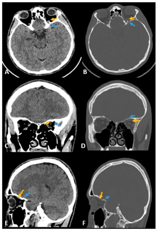 Axial (A), coronal (C), and sagittal (E) CT images in the parenchymal window and axial (B), coronal (D), and sagittal (F) CT images in the bone window show the contact of the millimetric bone fragment in the orbital roof (blue arrow) with the superior rectus muscle (yellow arrow).
