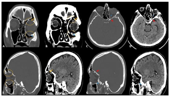 Coronal (A), axial (C), and sagittal (E,G) CT images in the bone window and coronal (B), axial (D), and sagittal (F,H) CT images in the parenchymal window. There are herniations of both fat (yellow circle) and superior rectus muscle (yellow arrow) due to the fracture in the roof of the orbit and fatty tissue (yellow circle) due to the fracture in the orbital floor. The fracture in the orbital roof extends into the optic canal (red arrow). The fracture in the lower wall also affects the infraorbital nerve (blue arrow).