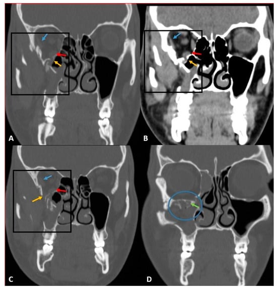 CT images in the coronal bone window (A,C,D) and coronal parenchyma window (B). There are multi-part displaced fracture lines on the orbital lateral, inferior, and maxillary sinus lateral wall (black square). Displaced bone fragments in the orbital inferior and lateral walls contact the inferior rectus (red arrow) and lateral rectus (blue arrow) muscles. Orbital fat tissue herniations (yellow arrow) are seen in different foci that herniate into the maxillary sinus due to inferior orbital wall fracture. The fracture line on the inferior orbital wall extends to the lateral wall of the infraorbital canal (blue circle), which contains the infraorbital nerve (green arrow).