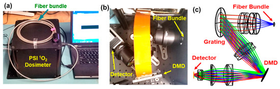 Photographs (a,b) and optical layout (c) of a prototype computational spectroscopy (CS) singlet oxygen (1O2) spectrometer using a digital micromirror device (DMD).