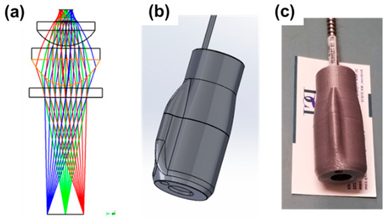 To optimize the light collection efficiency, a fiber light collector was designed and fabricated using a high numerical aperture aspheric lens (f = 12 mm, ACL1512U, Thorlabs, Newton, NJ, USA) and a plano-convex lens (f = 15 mm, LA1540C, Thorlabs). The Zemax optical design is shown in Figure 3a. A 3D printed assembly was developed to mount the lenses and the fiber (Figure 3b,c). A miniature visible wavelength camera (XDT311M5, Misumi, New Taipei City, Taiwan) was also incorporated into the 3D printed light collector as an add-on feature. This camera guided the alignment of the fiber collector to the irradiated skin area and collected PS fluorescence in the visible wavelength range (450 nm to 750 nm).