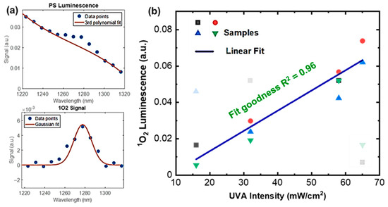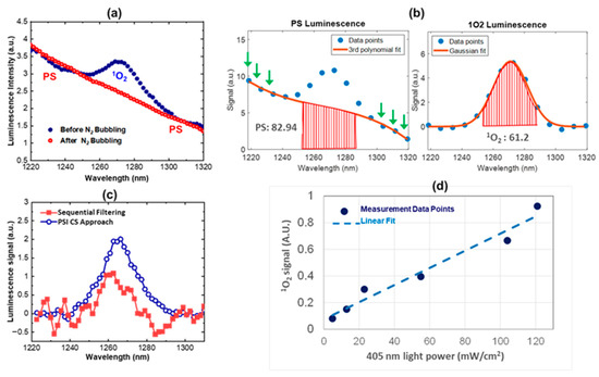 Figure 4d shows the measured 1O2 luminescence at different excitation intensity levels, which has a linear correlation with a goodness of fit of 0.92. These data validate our developed algorithms for PS baseline determination/subtraction and thus singlet oxygen quantification.