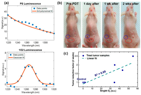 Figure 5a shows example measurements of PS and 1O2 from a living mouse during the PDT treatment. High SNR measurements of 1O2 were demonstrated by the high-fidelity Gaussian fit (fit goodness R2 = 0.98) to the measurement data points in the 1O2 spectrum (lower panel of Figure 5a). This CS spectrometer was calibrated against a blackbody emitter (SR-2-33, CI Systems, Carrollton, TX, USA). To the best of our knowledge, the spectra in Figure 5a are the first high-resolution PS and 1O2 spectra measured from a living mouse during ALA PDT treatment of skin cancer. Photographs of the tumors pre- and post-treatment are shown in Figure 5b. Visual inspection indicates that in the treated areas, i.e., within the circled areas, tumor shrinkage is clearly shown over the two-week period subsequent to the one-time PDT treatment. In contrast, untreated tumors (outside the circles) continued to grow. The 1O2 measurement was correlated to the tumor reduction rate, as shown in Figure 5c. A linear fit to the data points demonstrates the positive correlation between 1O2 measurement with tumor reduction rate. The R2 value for the fit is 0.66, demonstrating correlation between the singlet oxygen value measured by the CS spectrometer and the PDT treatment efficacy. The high SNR measurement of 1O2 and its positive correlation with tumor reduction demonstrates the value of the CS-based luminescence detection technology in monitoring and optimizing PDT treatment outcome.