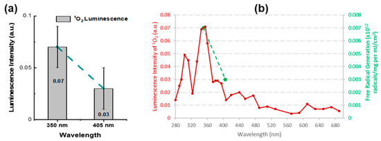 Figure 7 represents a measurement of the 1O2 produced by two UV wavelengths, i.e., 350 nm and 405 nm. This finding is consistent with the action spectrum of reactive oxygen species measured ex vivo using electron spin resonance (ESR) over a wide spectral range [53]. These results suggest that noninvasive 1O2 detection may be a good surrogate to measure ROS in vivo. Because ROS produced by UV irradiation are responsible for DNA mutations and skin cancer, the 1O2 detection may provide a valuable new tool for studies of UVA skin damage mechanisms.