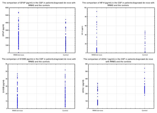 Heavy neurofilament (NF-H) is a promising biomarker of disease activity in RRMS. In our study, NF-H concentrations in the CSF were significantly higher in patients diagnosed de novo with RRMS than in healthy controls. Herrera et al. also showed increased NF-H concentrations in patients with 5 year RRMS evolution. In their study, a correlation between NF-H levels and disease progression was observed, which suggested its potential reliability in monitoring the clinical condition of RRMS patients [39]. Shehab et al. obtained similar results. Additionally, in their study, the pNF-H levels were significantly higher in the relapsing group than in the remitting group [40]. Another study revealed higher levels of pNF-H in the CSF of CIS patients that converted to RRMS in 3 years than in CIS patients who did not develop MS at the same time [41].