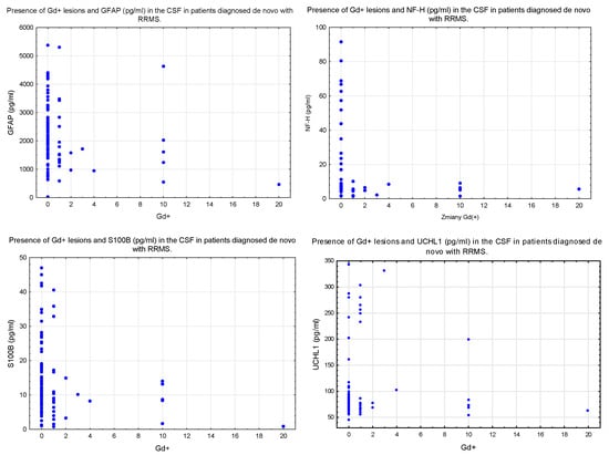 Presence of Gd+ lesions and the selected parameters of brain injury in the CSF in patients diagnosed de novo with RRMS.