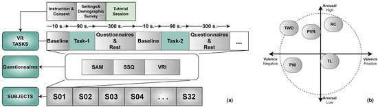 (a) Experimental paradigm for five different types of VR scenes (b) valence-arousal space.