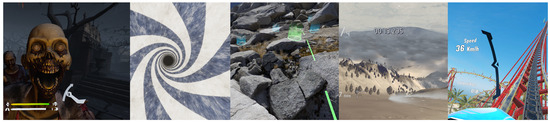 In contrast to AR, VR fully immerses the user in a computer-generated simulation. Consequently, VR necessitates using VR devices to enhance the virtual experience. Nevertheless, ongoing developments aim to mitigate the adverse effects of this technology on users. Immersive virtual reality (IVR) involves presenting a VE so convincingly that it alters the user’s perception of the natural world, enabling complete engagement with the virtual environment [4]. The stimulus scenes in our study were chosen to be close to IVR. Despite providing a heightened sense of immersion, VR can also induce discomfort symptoms, commonly called cybersickness (CS), which has garnered significant attention in recent VR studies [5,6,7].