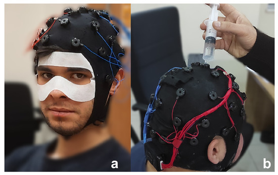 Within the project’s scope, 35 adults volunteered to participate in this study. However, one participant used their right to withdraw from the experiment, and one participant’s data could not be used because of the experiment’s faulty hardware data collection system. The other participant was unable to complete the experiment because of extreme dizziness and nausea. Therefore, the experiment was conducted with the remaining 32 (right-handed) volunteer participants (21 males, 11 females, age range 18–30, ). They had no visual or hearing impairments and normal or corrected vision. The participants were presented with a demographic survey before the experiment, which included their VR experience. Hygiene measures were taken with a Disposable VR Hygienic Mask compatible with HTC Vive. The necessary preparations were made for the contact quality of the EEG electrodes (Figure 5). On average, participants had little VR experience ( on a 7-point Likert scale, , 1: none, 7: a lot); While twenty-three participants (71.87%) had never experienced VR before, nine participants (28.13%) had VR experience close to the “none” scale.