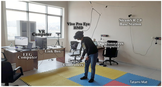 Our experimental equipment consisted of the following parts: three computers (VR computer, EEG computer, and questionnaire computer) and an HTC (High-Tech Computer) Vive Pro Eye (HTC Corporation, Taoyuan City, Taiwan) HMD for locomotion VR scenes. The VR device was connected to a desktop computer (VR computer) with 64 GB RAM and an Intel Core i7-9700K processor running at 3.60 GHz. The Emotiv Epoc Flex device was wirelessly connected to a laptop (EEG computer) with 32 GB RAM and an Intel Core i7-11800H processor running at 2.30 GHz. The questionnaires were taken from a laptop computer (questionnaire computer) with an i5 processor and 8 GB RAM. The desktop computer had an Nvidia GeForce RTX 2080 Super GPU (8 GB), whereas the laptop had an Nvidia GeForce RTX 3080 GPU (16 GB) graphics card (Figure 6). The Emotiv Cortex API software (version 2.0) was configured (C Sharp programming) to ensure computer synchronization. The Cortex API is built on JSON and WebSockets, making accessing various programming languages and platforms easy.
