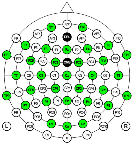 EEG signals were collected by Emotiv EPOC Flex equipment, including a cap with 32 and two reference electrodes. It has been proven that the EMOTIV EPOC Flex can capture data similar to research-grade EEG systems [55]. Electrode placement follows a 10–20 system. Additionally, to prevent the HMD from exerting pressure on the anterior central electrodes, three elastic bands were used to fix the HMD, while the upper elastic band of the HMD was loose. The bands were placed between the electrodes. The EEG electrode configuration is shown in Figure 7. All electrodes were referenced to AFz (Driven-Right-Leg sensor, DRL) and FCz (Common-Mode Sensor, CMS) and grounded to the forehead. The electrodes on the cap were filled with saline solution to ensure the quality of EEG signals.