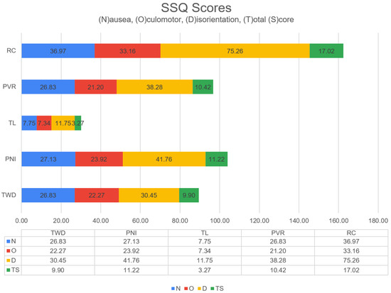 Self-reported measures were obtained via the SSQ and VRI immersion questionnaires. This study assessed the occurrence of CS in participants within virtual environments. Table 4 presents the scores for each variable relative to CS (, and ). The median values of N and D are zero for the TL scene, indicating that this scene triggers less CS. It also stands out in terms of the CS level for RC and D.