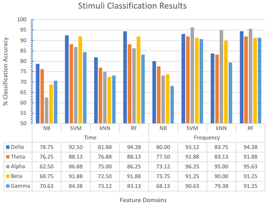 Feature extraction is an introductory section of classification algorithms. These features can be obtained from various domains [56]. Extracting more dominant features from an EEG signal is essential for classification. Because of their nature, EEG signals have nonlinear and spatiotemporal structures. Therefore, extracting features in the time and frequency domains from the signal [57] is significant in determining the most distinctive features for classification.