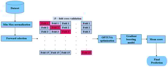In this paper, we aim to improve the accuracy of predicting HCV disease among healthcare patients in Egypt by developing the hyOPTGB model. The system is designed to distinguish between HCV-infected patients and non-infected patients. Min-Max normalization is used to normalize the data; also, the forward selection (FS) wrapped method is used to select the most important features to increase the accuracy and efficiency of the classification process. To optimize the performance of the gradient boosting model, we fine-tuned its hyperparameters and then trained it using the resulting optimal parameters. We relied on the OPTUNA framework to carry out the hyperparameter tuning process. To evaluate the performance of our approach, we used a k-fold cross-validation (k = 15) method on the training data. Our optimization goal is to improve the model’s accuracy with each iteration. We have provided a visual representation of our proposed hyOPTGB model in Figure 1.