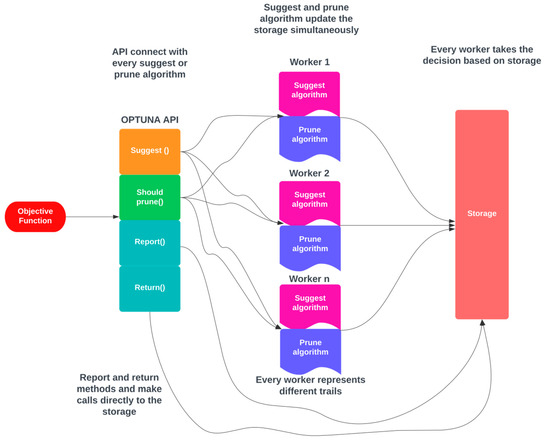 By default, OPTUNA employs its memory data structure as a storage location; thus, making it effortless to use for simple purposes, which is an essential prerequisite for a contemporary hyperparameter optimization framework. OPTUNA offers numerous advanced capabilities, such as performing independent and relational sampling and providing various pruning algorithms, making it a superior framework for hyperparameter tuning. The architecture of OPTUNA is depicted in Figure 4. In OPTUNA, each worker in every sample executes the objective function (OF) once. The OF is executed through OPTUNA APIs, and when the moment API is called, it accesses the storage and retrieves any relevant data from previous samples stored in memory [39]. The workers operate independently, and they use the repository to track the results of the current study.