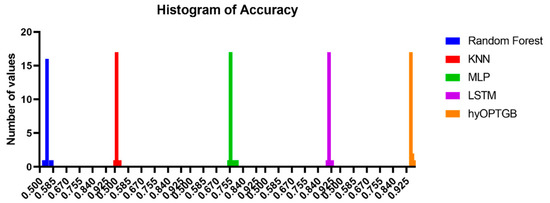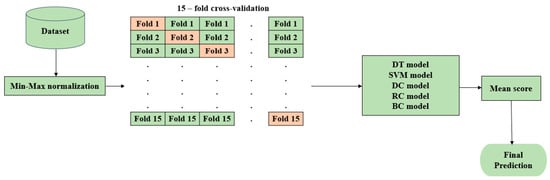 This section employs five different machine learning classification models, namely, decision tree (DT), support vector machine (SVM), dummy classifier (DC), ridge classifier (RC), and bagging classifier (BC), to evaluate and compare their performance with the proposed hyOPTGB model. Min-Max normalization and 15-fold cross-validation are performed for the five machine learning models using their default hyperparameters. The architecture for the five machine learning models is in Figure 5.