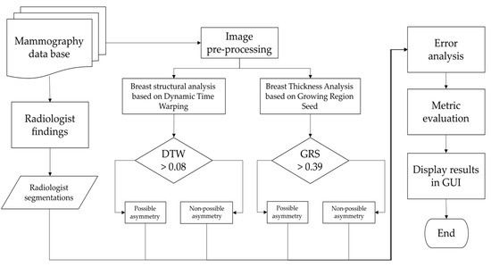 This section provides a detailed explanation of the procedure employed to identify potential cases of asymmetry based on the analysis of breast morphology and skin thickness differences between contralateral breasts. The procedure involves several steps, including data collection, image preprocessing, feature extraction, and statistical analysis. The methodology ensures a systematic and rigorous approach to identifying and classifying asymmetry in breast images, contributing to the early detection of potential abnormalities. Figure 2 depicts a flowchart for this section.