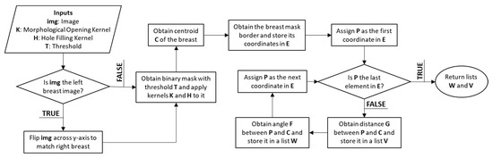 Nevertheless, an important factor to consider is the orientation of the breast. Hence, both images (i.e., left, and right breast images) were adjusted to the same orientation, i.e., towards the right. The hypothesis proposes that the set of distances would differ between left and right views of the breast. To maintain consistency and ensure direct comparability, all images were oriented toward the right. Although orienting the image set towards the left is feasible, it would necessitate image reprocessing and algorithm adjustments to adjust the left-oriented images. Our specific focus on the right-oriented images allowed us to investigate the impact of asymmetry on the right breast and evaluate the effectiveness of our proposed approach. Figure 3 presents the flowchart used to obtain a collection of distances between the centroid and the edge of the breast, depicted in Figure 4. Appendix A provides the pseudocode for the algorithm.