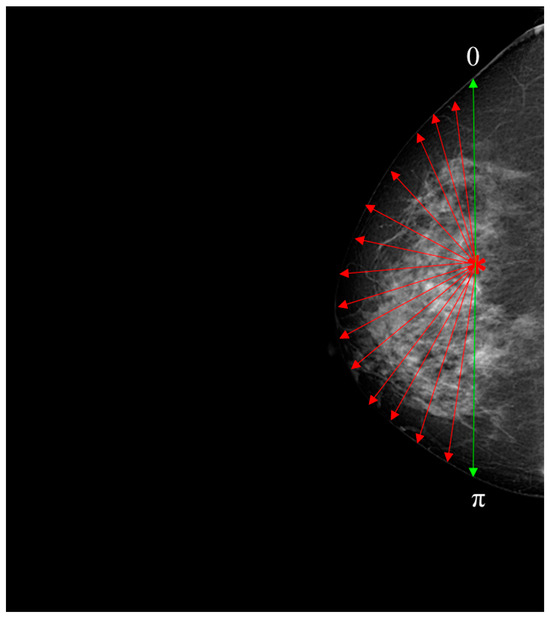 This diagram serves as an illustrative representation demonstrating the process of deriving a set of distances between the centroid and the periphery of the breast. The centroid is indicated by the asterisk symbol, while the red radius is depicted as arrows extending towards the edge of the breast and the green arrows indicate the beginning and ending [0–π].