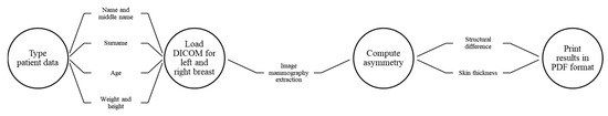 Once the mammography images are loaded, the CAD system performs a comprehensive analysis using advanced image processing techniques, feature extraction, and pattern recognition algorithms. The GUI presents the diagnostic results in a concise and visually informative manner, allowing medical professionals to interpret and evaluate the findings effectively. The aim is to provide accurate and reliable assessments of breast asymmetry, aiding in the subsequent diagnosis and treatment planning process. In addition to real-time analysis, the GUI enables the generation of detailed PDF reports summarizing the patient’s information, image analysis results, and diagnostic outcomes related to breast asymmetry. These reports serve as valuable resources for medical practitioners, providing a comprehensive overview of the patient’s condition and facilitating effective communication and collaboration among healthcare professionals. Figure 6 depicts the steps of the GUI system.