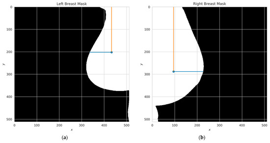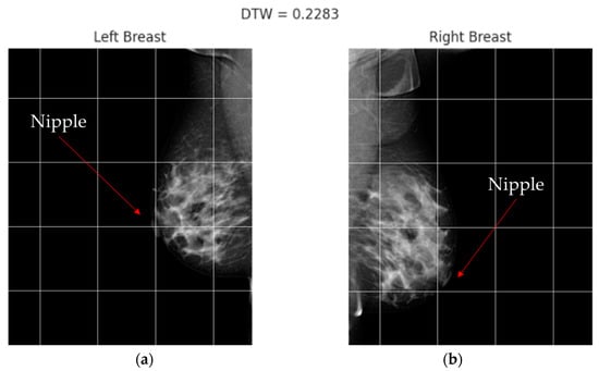 The approach of DTW in our study is well-established and widely used in various fields, including speech recognition, image processing, and pattern recognition. DTW allows for finding the optimal alignment path between two sequences, considering temporal or spatial distortions between them. The algorithm follows a right, diagonal, and down approach related to three fundamental conditions: boundary, monotonicity, and continuity [27]. The boundary condition ensures that the warping path must begin with the starting points of both signals and end with their endpoints. The monotonicity condition preserves the relationship in time, meaning a point from signal A in position x_n must not be aligned with a point from signal B in position x_n − 1. This constraint is the main reason why the approach follows a right, diagonal, and down path. Lastly, the continuity condition limits the number of steps a point from signal A may take to align itself with a point in signal B. While other alignment methods like left, diagonal, and up approaches are theoretically possible, they are less commonly used in image analysis and sequence comparison. In our application of breast image asymmetry analysis, the right, diagonal, and down approach offers better alignment accuracy. We have conducted a thorough review of the related literature and found numerous studies that utilized DTW with the right, diagonal, and down approach for similar applications, such as feature extraction and sequence alignment in medical imaging and time-series analysis [27,28]. Introducing the left, diagonal, and up approach might lead to less accurate alignment and could compromise the reliability of our asymmetry analysis results. Therefore, in alignment with the existing literature and to ensure robust and accurate results, we maintain the use of the right, diagonal, and down approach in our study of breast image asymmetry analysis.