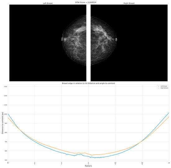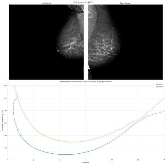 After obtaining the set of distances between the centroid and the edge of the breast at the angles ranging from 0 to π radians, a vector comprising these distances is extracted. This vector serves the purpose of enabling a structural comparison of shape between the contralateral breasts. It is assumed that the presence of asymmetry is indicated when shape similarity between the two vectors is lacking. To assess the similarity between both vectors, Dynamic Time Warping (DTW) can be used to assess alikeness.