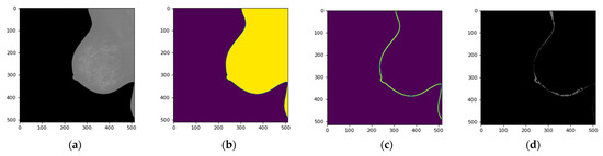 The first step was to obtain a mask by the Otsu method to eliminate low-contrast tissue. Then, erosion was performed on the binary image using a kernel with size 8, which determines the border thickness. By comparing the mask concerning the border coordinates, we obtain the pixels that changed after erosion, thus retaining only the boundary of the breast. Then, a window with zero matrices with dimensions (n + 2) × (m + 2) was created, and a line of pixels at the top, bottom, left, and right, to evaluate the border pixels during region growth without requiring special functions. The output of these steps is an image with the same size as the original mammography but with these black border pixels, allowing post-processing instead of the original image without encountering border-related issues. To mitigate the issue of jagged edges observed in the mask when directly applying the Volume of Interest Look-Up Table (VOI LUT) technique, an alternative approach was adopted. However, the resulting mask was subsequently applied to the mammograms that had undergone normalization using the VOI LUT method. The VOI LUT is a technique employed in medical imaging to enhance the visualization of image data by mapping pixel values to a desired display intensity range. It is an important component in the post-processing pipeline for adjusting the windowing and leveling of medical images. The VOI LUT operates by applying a linear transformation to the pixel values, thereby adjusting their brightness and contrast characteristics. This allows medical professionals to better perceive subtle details and abnormalities in the image. The application of the VOI LUT is typically performed by specific standards and algorithms, ensuring consistent and reproducible results across different imaging systems. By effectively optimizing the display of medical images, the VOI LUT contributes to the accurate interpretation and diagnosis of various medical conditions [30].