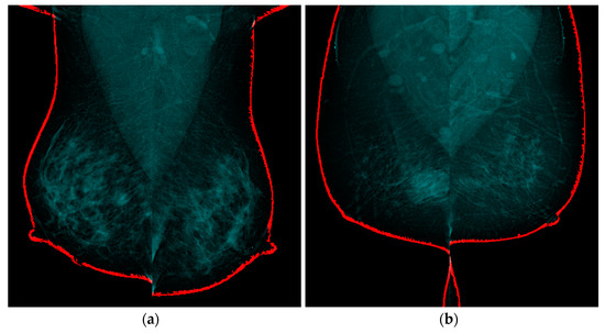 Breast skin segmentation enables a comprehensive evaluation of breast morphology, for the detection and characterization of asymmetrical regions. This information is crucial in the early detection and diagnosis of breast cancer, as asymmetry can be a significant indicator of the presence of tumors or other abnormalities [14]. Figure 13 presents the results of the GSR method.