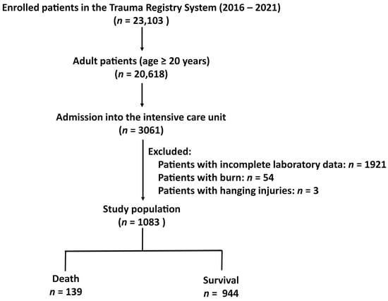 Between 1 January 2016 and 31 December 2021, there were a total of 23,103 hospitalized patients who sustained injuries from various causes of trauma and were admitted to the Trauma Registry System of Chang Gung Memorial Hospital [42] (Figure 1). Among these, there were 20,618 adult patients aged 20 years and older; 3061 patients were admitted to the ICU. Following the exclusion of patients with incomplete data regarding albumin or bilirubin levels (n = 1921) with burn injuries (n = 54), hanging injuries (n = 19), and those who drowned (n = 3), a study population of 1083 adult trauma patients was finally established. Data pertaining to this study group were extracted from a registered trauma database and included information such as sex, age, serum albumin and total bilirubin levels upon admission, pre-existing medical conditions, Glasgow Coma Scale (GCS) scores, injury severity scores (ISS), length of hospital stay, and in-hospital mortality. The easy albumin–bilirubin (EZ–ALBI) score was calculated using the following formula: total bilirubin (mg/dL) − 9 × albumin (g/dL).