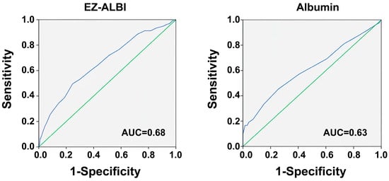 Based on the ROC curve analysis, an EZ-ALBI score of −26.5 was determined as the optimal cut-off point, which demonstrated the highest AUC value of 0.68. At this cut-off, the sensitivity and specificity were 0.516 and 0.753, respectively (Figure 2). As indicated in Table 3, patients with an EZ–ALBI score ≥ −26.5 were primarily male and notably older compared to those with an EZ–ALBI score < −26.5. Among patients with an EZ-ALBI score ≥ −26.5, there was a significantly higher prevalence of pre-existing ESRD, although there were no notable differences in other comorbidities when compared to those with an EZ-ALBI score < −26.5. However, albumin alone had the highest AUC value of 0.63 when predicting the outcome, with a cut-off value of 2.95 g/dL. The ability of EZ–ALBI to predict patient mortality was moderately accurate and substantially superior to that of albumin alone (p = 0.048).