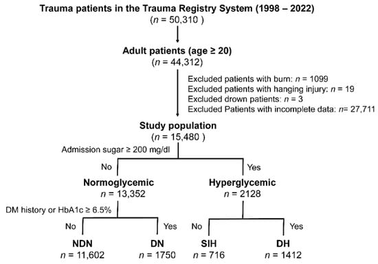 In this research, adult trauma patients aged 20 years and above were examined, drawing from a pool of 50,310 trauma patients admitted to the hospital via the emergency room from 1 January 1998 to 31 December 2022 (as illustrated in Figure 1). The exclusion criteria included patients with specific trauma injuries such as burns, hanging injuries, or drowning, and those who lacked full admission data on glucose levels, specific WBC subsets, and platelet counts. This left us with a total of 15,480 patients for the analysis. For the purpose of this study, “Hyperglycemia” denotes emergency department serum glucose levels at or above 200 mg/dL. The study classified patients into four distinct groups: NDN, DN, SIH, and DH, based on the below definitions.