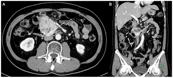 Axial (A) and coronal (B) computed tomography images 1 year post open irreversible electroporation. The pancreatic mass now measures approximately 3.9 × 2.6 cm.