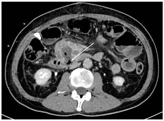 Axial computed tomography image post open irreversible electroporation. At the location of the tumor invasion of the duodenum, there is a defect in the wall with gas seen (arrow). This likely represents perforation of the duodenum due to breakdown of the ablated tumor.
