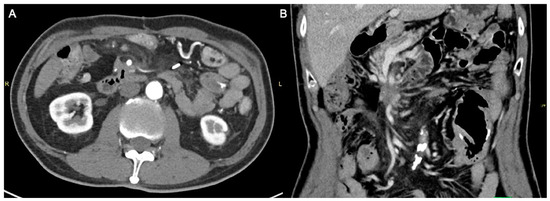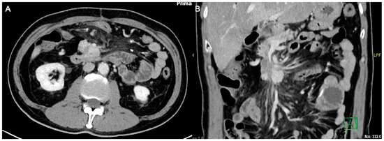 Axial (A) and coronal (B) computed tomography images of the patient demonstrating a heterogeneously enhancing pancreatic mass measuring approximately 6.3 × 4.4 cm. There is duodenal involvement by the pancreatic mass (arrows).