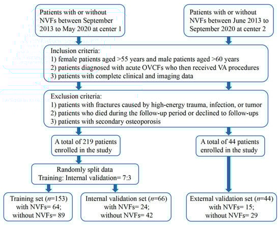 The T1-weighted MRI images and clinical data of patients who underwent the VA procedure at center 1 between September 2013 and May 2020 and center 2 between June 2013 and September 2020 were reviewed (Figure 1). The inclusion criteria were as follows: (1) female patients aged >55 years and male patients aged >60 years; (2) patients diagnosed with acute OVCFs who then received VA procedures; and (3) patients with complete clinical and imaging data. The exclusion criteria were as follows: (1) patients with fractures caused by high-energy trauma, infection, or tumor; (2) patients who died during the follow-up period or declined to follow-ups; and (3) patients with secondary osteoporosis due to hyperparathyroidism, inflammatory bowel disease, or renal failure.