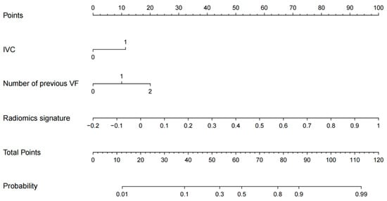 In the training set, four variables, including age, radiomics signature, IVC, and number of previous VFs, were found to be significant at a level of p < 0.05 based on the univariate logistic regression algorithm (Table 2). Among them, three variables, including the number of previous VFs, IVC, and radiomics signature, were selected using the multivariate logistic regression algorithm. Then, a radiomics nomogram incorporating these three variables was developed based on the multivariate logistic regression model (Figure 2).