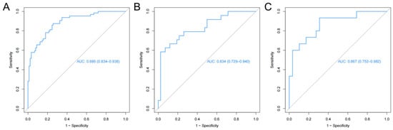 Receiver operating characteristic curves of the radiomics nomogram. (A) Training set, (B) internal validation set, (C) external validation set.