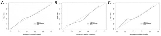 Calibration curves of the radiomics nomogram. (A) Training set, (B) internal validation set, (C) external validation set.