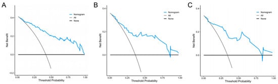 Decision curve analyses for the radiomics nomogram. The blue line represents the radiomics nomogram. The gray line represents the hypothesis that all patients had NVFs. The black line represents the hypothesis that no patients had NVFs. (A) Training set, (B) internal validation set, (C) external validation set.