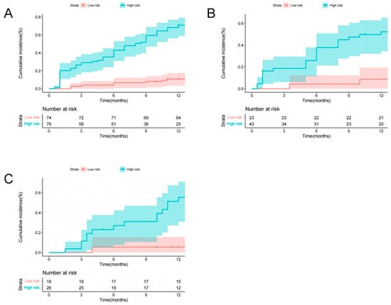 Graphs show cumulative incidence of NVFs according to two risk strata defined by the radiomics nomogram in the training (A), internal validation (B), and external validation (C) sets.