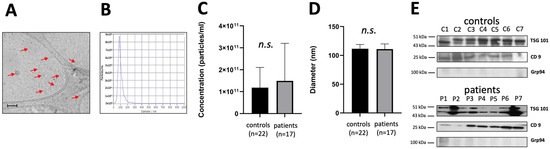 sEVs were extracted from plasma or supernatants using SEC and characterized according to MISEV2018 guidelines [17]. Visualized using Cryo-EM, the purified sEVs revealed the typical vesicular morphology with average diameters of 30–120 nm and 4 nm lipid bilayer membranes (Figure 1A). Average particle diameters ranged from 85–120 nm as determined with NTA (Figure 1B). When comparing sEVs isolated from plasma of cholesteatoma patients with sEVs isolated from plasma of controls no significant differences were observed for the concentration of sEVs as well as their diameters (Figure 1C,D). Immunoblotting analysis of sEVs from fraction No. 4 revealed that sEVs carried the sEV markers TSG101 and CD9, together with showing the absence of the negative sEV marker, Grp94 (Figure 1E).