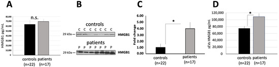 The levels of HMGB1 in plasma and in sEVs of cholesteatoma patients. (A) HMGB1 levels in plasma of cholesteatoma patients and controls (no significant difference, n.s.); (B) Representative western blots show HMGB1 enriched in plasma-derived sEVs from controls (C1–C7) compared to cholesteatoma patients (P1–P7); (C) Semiquantitative evaluation of Western blots using ImageJ 1.46r software; (D) HMGB1 levels in plasma-derived sEVs (1 μg) lysed with extraction buffer of cholesteatoma patients and controls, as described in Section 2, (* p < 0.05, no significant difference, n.s.).