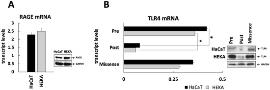 RAGE and TLR4 expression in cultured keratinocytes. (A) RAGE expression at the mRNA and protein levels was determined in HaCaT and HEKA cells by RT-PCR and Western blotting; (B) Since HMGB1 is also a ligand for TLR4 in addition to activating RAGE, TLR4 was silenced in HaCaT and HEKA cells (as described in Section 2). TLR4 mRNA and protein levels in HaCaT and HEKA cells before and after stable silencing with the lentiviral vector or silencing with scrambled RNA (“missense”), (* p < 0.05).