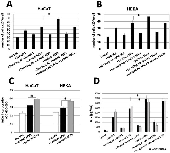 The proliferation and cytokine production of HaCaT and HEKA cells in response to pooled samples of sEVs isolated from the plasma of cholesteatoma patients and controls. HaCaT cells (A) and HEKA cells (B) were incubated with 3 μg of sEVs at the concentration of 1 μg/μL from the plasma of cholesteatoma patients or from controls. Cell viability and proliferation was assessed after 72 h of culture using microscopy after trypan blue staining. (C) BrdU incorporation assay was used (as described in Section 2) in HaCaT and HEKA cells confirming significant differences in the induction of proliferation between normal sEVs and patient sEVs. Data represent mean ± SD from three independent experiments performed in triplicate. (D) Levels of IL-6 measured by ELISA assay in HaCaT and HEKA culture supernatants in the presence or absence of HMGB1, RAGE-specific antibodies, and sEVs isolated from the plasma of cholesteatoma patients and controls; IL-6 values were normalized to the 30 × 103 cell count of HaCaT and HEKA cells. All values in this figure represent means ± SD from three experiments with each sample run in triplicate. * p < 0.05.