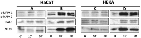 In order to assess the molecular pathways involved in the induction of HaCaT or HEKA cell proliferation and proinflammatory cytokine production upon stimulation with normal control or cholesteatoma sEVs, components of the MAPKp44/p42, STAT3, and the NF-κB pathway components were examined. In our previous study, we have shown that the above mentioned molecules are overexpressed in cholesteatoma tissues [12]. Moreover, all these molecules were constitutively expressed in the nonphosphorylated form in TLR4-silenced HaCaT and HEKA cells [12]. The phosphorylated forms of these proteins were not or only weakly expressed in HaCaT or HEKA cells not stimulated with sEVs. After normal control or cholesteatoma sEV stimulation for 10 to 30 min, phosphoprotein levels weakly (Figure 5A,C) or dramatically increased in HaCaT and HEKA cells (Figure 5B,D), respectively. As this Ab was shown to interfere with HMGB1-mediated induction of proliferation and cytokine production in HaCaT or HEKA cells (see above), our data suggest that HMGB1(+) sEV-induced effects were mediated through phosphorylation of these proteins, and that the effect is much stronger for sEVs isolated from cholesteatoma patients.