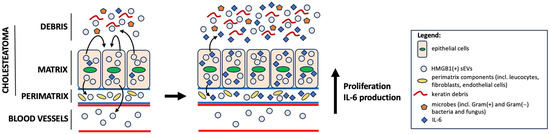 One of the hypothetical models for the progression of acquired cholesteatoma. In the tympanic cavity, there is a proliferation of keratinizing epithelial cells originating from the external auditory canal, which have penetrated the middle ear as a result of chronic perforation of the tympanic membrane (chronic otitis media). This causes local inflammation, uncontrolled development of microorganisms and activation of keratinizing epithelial cells, which, in turn, release enriched HMGB1(+) sEVs into the microenvironment and peripherally. HMGB1(+) sEVs cause, in a paracrine or autocrine mechanism, increased proliferation of keratinizing epithelial cells, as well as the production of the pro-inflammatory cytokine IL-6, which induces a whole cascade of inflammatory mechanisms in the microenvironment of acquired cholesteatoma (e.g., infiltration of pro-inflammatory cells, activation of endothelial cells and fibroblasts, etc.).